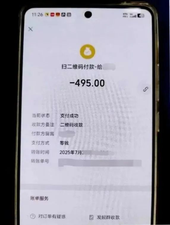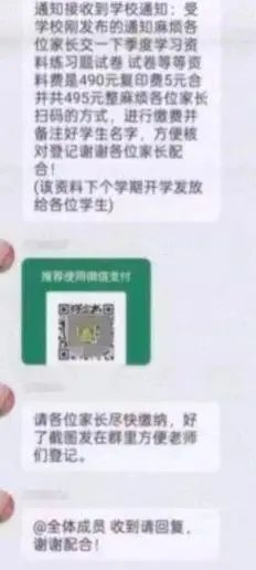 没承想,骗子也混入群内,冒充“群主”老师发送交费通知:“麻烦各位家长交一下季度学习资料、练习题试卷等资料费490元、复印费5元,合计共495元整。各位家长扫码进行缴费并备注好学生名字,方便核对登记,谢谢各位家长配合……”紧接着还发布了支付二维码,并@群内成员,要求尽快交费。
