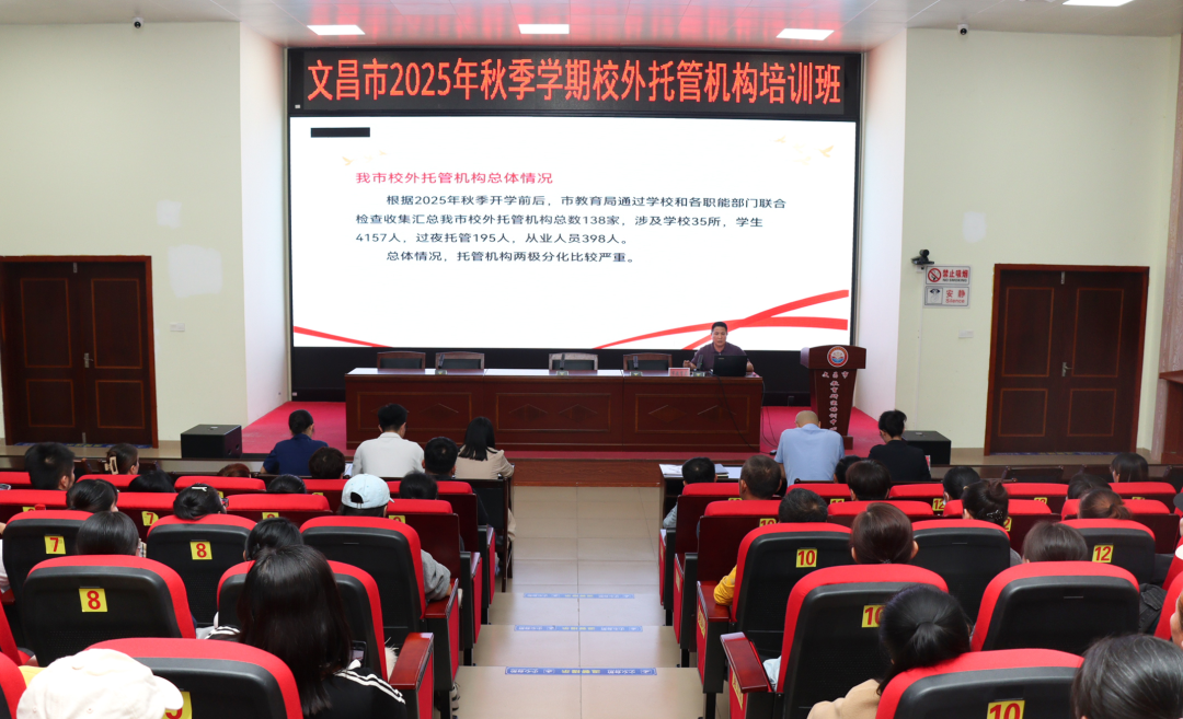 10月28日下午,文昌市2025年秋季学期校外托管机构培训成功举办。市教育局副局长王康宁出席活动并讲话。市教育局、市公安局、市疾控中心、市市场监督管理局、市住建局、市消防救援支队等单位业务骨干,以及全市校外托管机构负责人参加培训。