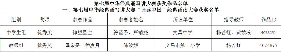 现将《教育部语用司关于公布第七届中华经典诵写讲大赛获奖名单的通知》(教语用司函〔2025〕8号)转发你们。2025年,我省各地各校认真组织发动广大师生踊跃参与第七届中华经典诵写讲大赛活动,以“典耀中华,赓续文脉”为主题,通过诵读、讲解、书写、篆刻等语言文字表现形式,弘扬中华优秀语言文化,从中华经典中汲取智慧力量、坚定理想信念、彰显时代精神,展现社会大众尤其是青少年对中华经典的传承与创新,取得了新的进步和突破。经大赛组委会评选,我省共有133件作品获奖,其中,6件作品获全国一等奖、17件作品获全国二等奖、35件作品获全国三等奖,75件作品获全国优秀奖,6名教师获全国优秀指导教师奖、4个单位获全国优秀组织奖(集体)、2人获全国优秀组织奖(个人),具体名单详见附件。