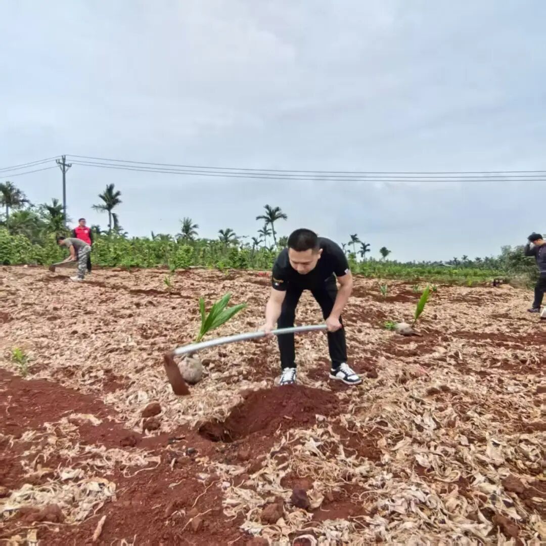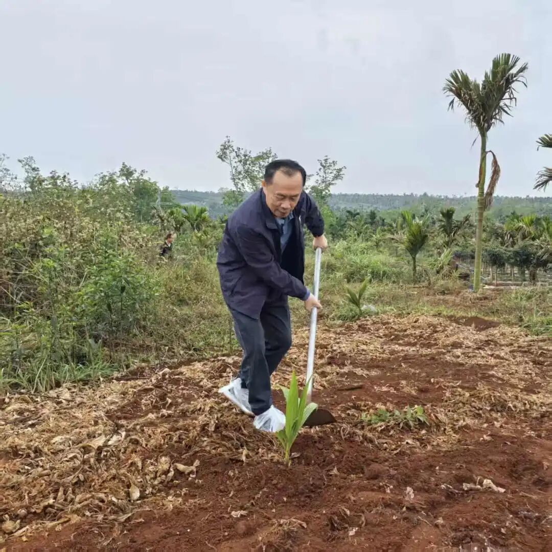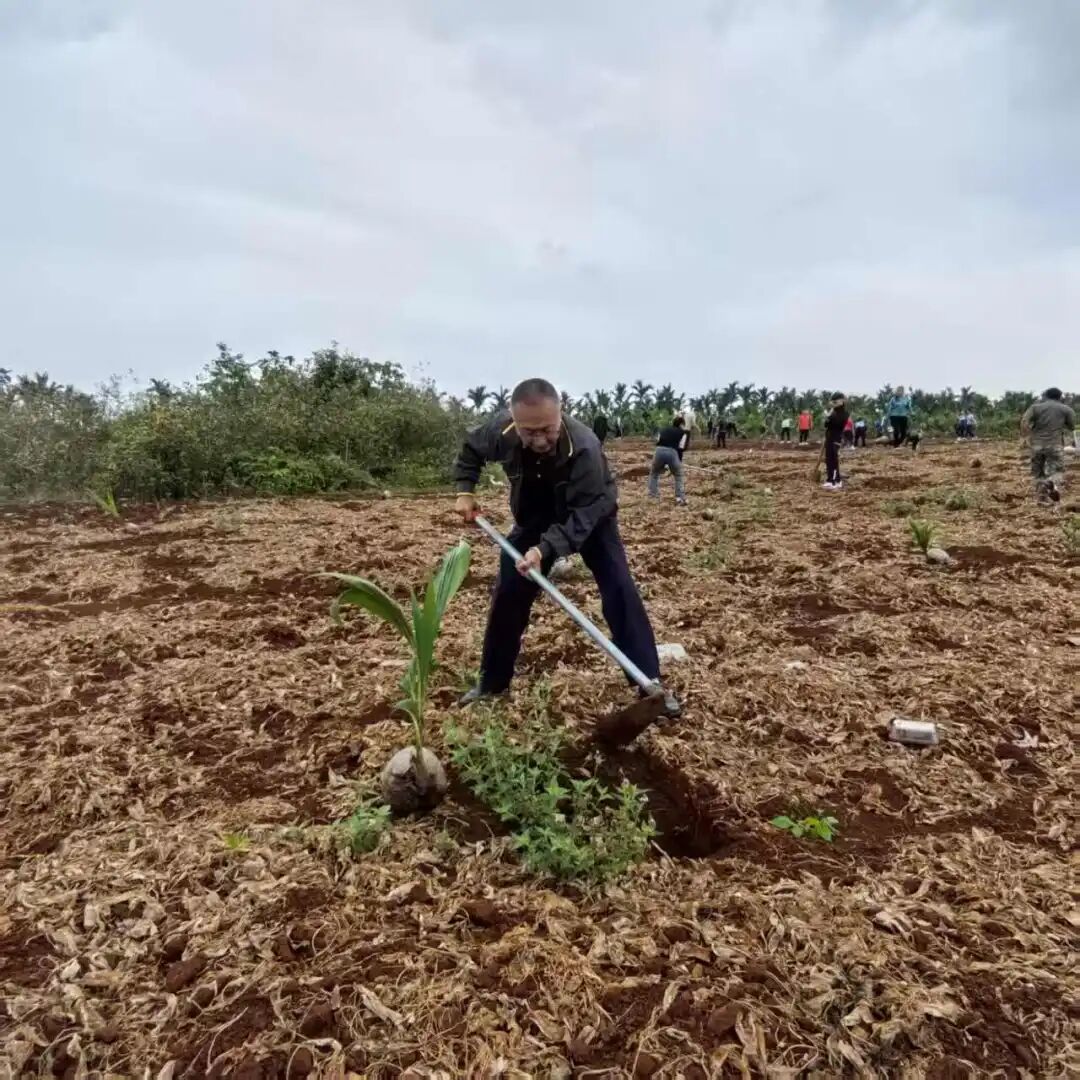 植树现场气氛热烈、井然有序。党员同志们精神振奋、分工协作,严格按照技术规范开展作业,挥锹铲土、扶苗入坑、培土围堰、提水浇灌,每一个环节都认真细致、一丝不苟。大家热情高涨、配合默契,展现出团结协作、奋勇争先的优良作风。经过两个多小时的劳动,一株株椰苗错落有致、迎风挺立,为初春的大地增添了勃勃生机。