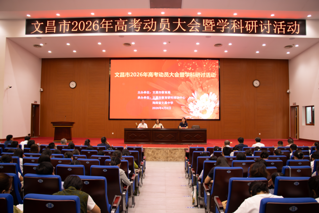 4月6日上午,市教育局组织召开文昌市2026年高考动员大会暨学科研讨活动。市政府副市长韩亮出席活动并讲话。市教培中心主任赵娜,市教培中心相关领导、中学教研室全体教研员,各高中学校书记、校长、分管教学副校长、教导室及教研室负责人以及全体高三任课教师参加活动。活动由市教育局副局长朱晓峰主持。