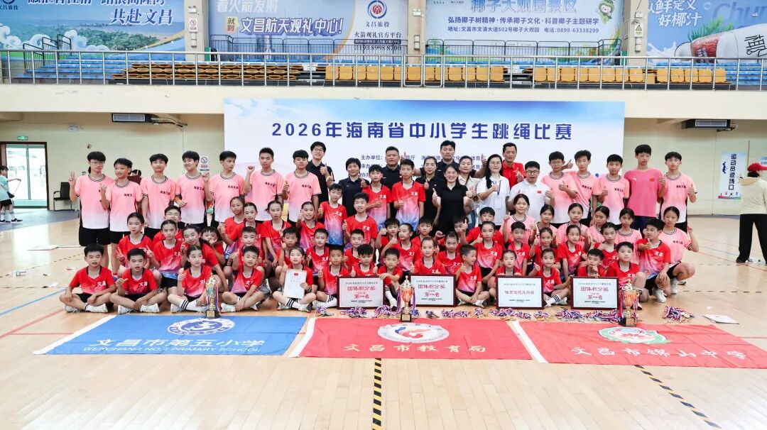 4月11日上午,由海南省教育厅、海南省旅游和文化广电体育厅主办,文昌市教育局、文昌市旅游和文化广电体育局承办,海南省学生体育协会、海南省跳绳运动协会、文昌市体育事务服务中心协办的2026年海南省中小学生跳绳比赛在文昌市排球馆圆满举办。省教育厅原副巡视员陈昌伟、省旅文厅原竞体处调研员何贤才、省教育厅体卫艺处原三级调研员钟瑞科、省教育厅体卫艺处主任于诗瑶,市教育局局长张光润、副局长朱晓峰出席现场观看比赛并为获奖代表队颁奖。