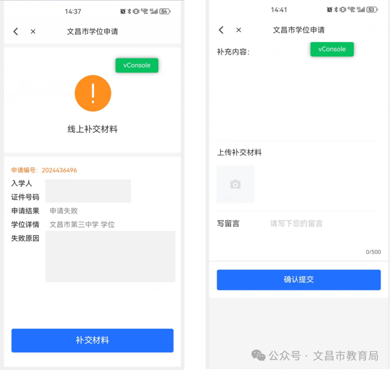 ④补交材料:学校审核时认为学生入学所需材料不全或线上提交的信息不足以证明入学资格,需补交材料;点击“补交材料”,可查看需补交的材料,拍照上传相关的材料进行提交,也可通过留言补充说明情况。提交材料后,学校可重新审核。