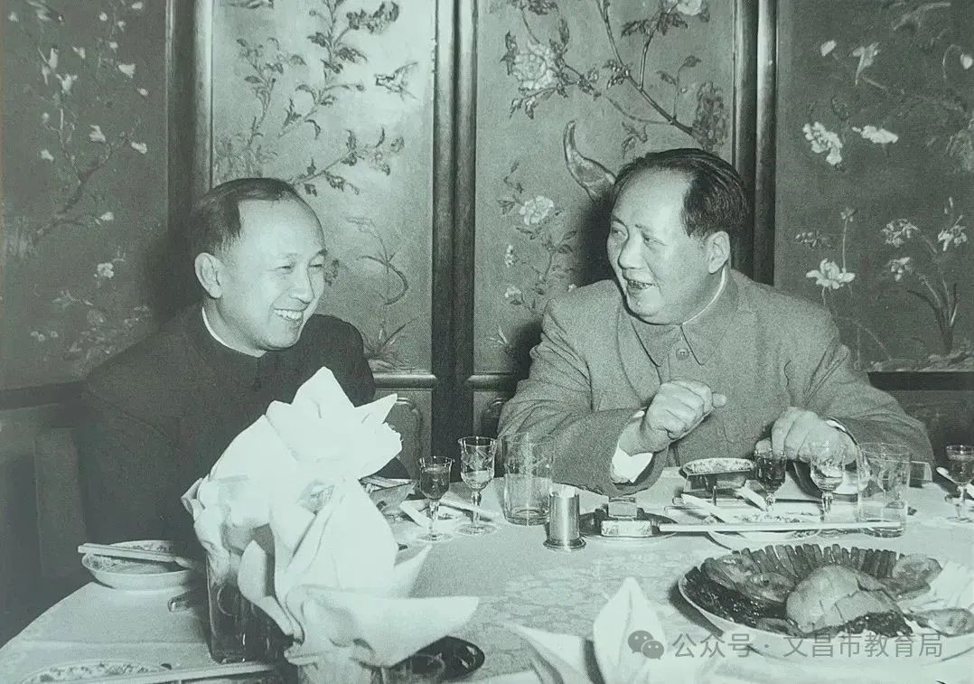 1956年2月1日,毛泽东在中南海怀仁堂招待参加全国政协二届二次会议的部分委员。会后用餐时,前来参会的著名科学家钱学森手持请柬走到自己所在的第37桌,却发现桌上没有摆放写有自己名字的桌签。工作人员上前解释,说此前毛泽东看过名单,看到钱学森被安排在第37桌,特意亲笔把他的名字勾到第1桌,与自己坐在一起,位置就在毛泽东的右手边。就在这时,毛泽东在全场的掌声中来到宴会厅,热情招呼钱学森:“学森同志,请坐这里!”钱学森惊喜不已。一落座,毛泽东就与他热情交谈起来。毛泽东高兴地对钱学森说:“听说美国人把你当成五个师呢!我看,对我们来说,你比五个师的力量大得多。我正在研究你的工程控制论,用来指挥我国的经济建设。”这时,摄影师抓住两人微笑的瞬间,按动了相机快门。